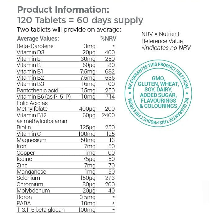 - Iron at 7mg per two tablet dose making it ideal for teenagers and menstruating women.