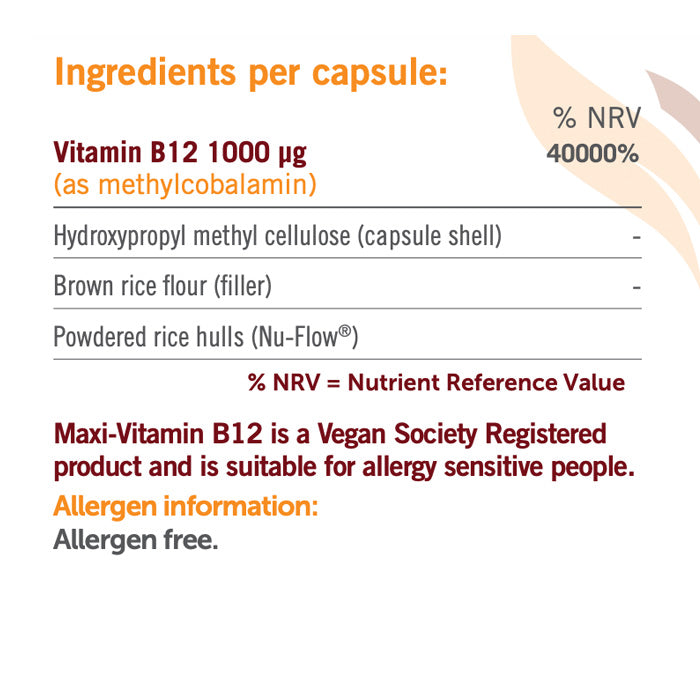 Made from only the finest quality vegan, allergen-and additive-free ingredients. Vitamin B12 has been demonstrated to support normal energy levels, reduce tiredness and fatigue, supports a healthy immune function, and the metabolism of homocysteine.