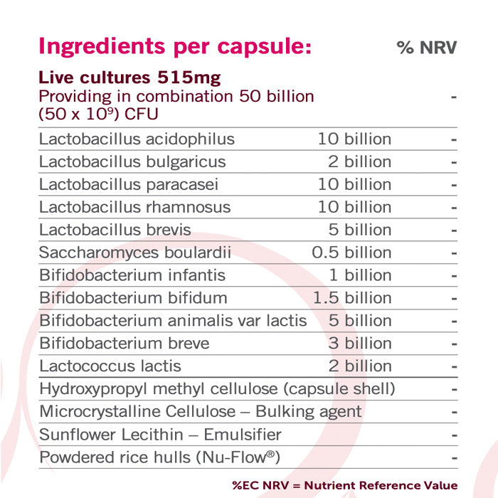 Sourced from only the finest grade culture ingredients, these capsules deliver a stable blend of eleven carefully selected bacterial cultures that have a demonstrated proven potency without the need for inconvenient refrigeration. This progressive formula is suitable for consumption by vegans and presented in an easy to swallow form.