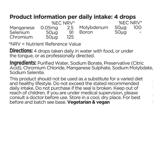 A highly absorbable liquid form of trace minerals in a purified water base, ideal for those who cannot swallow capsules or tablets. Provides chromium, selenium, molybdenum, boron and manganese.