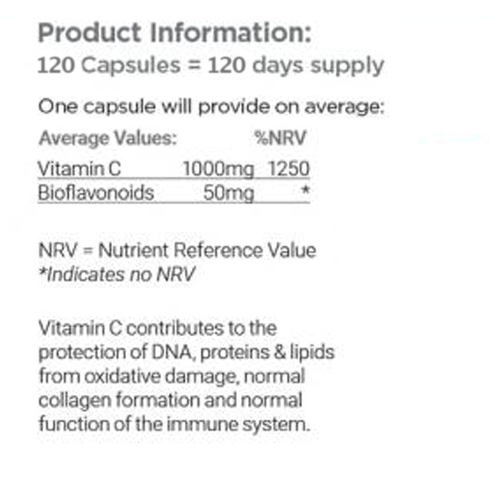 This supplement combines a high potency of 1000mg of vitamin C per capsule (as ascorbic acid) plus 50mg of bioflavonoids. Bioflavonoids naturally accompany vitamin C in fruit and vegetables.