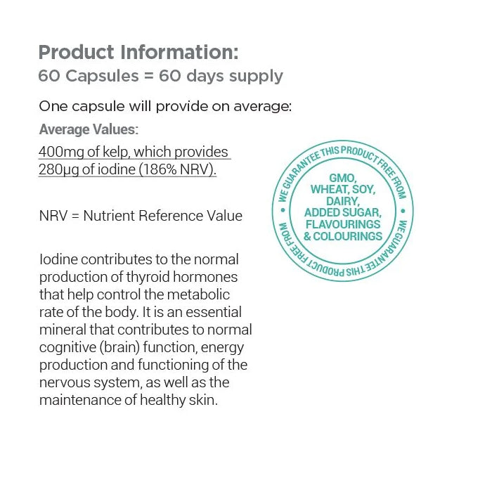 - Kelp contains large amounts of the mineral iodine which contributes to the normal production of thyroid hormones and normal thyroid function. Thyroid hormones have a wide range of functions in metabolism.